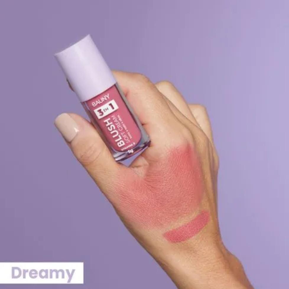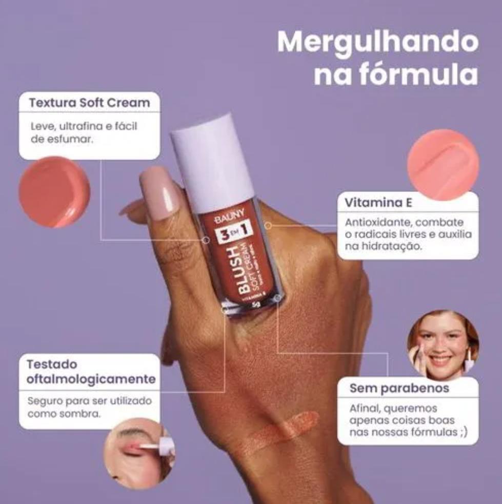 O blush líquido Soft Cream 3x1 da Bauny traz alta performance, com efeito natural e fácil aplicação.