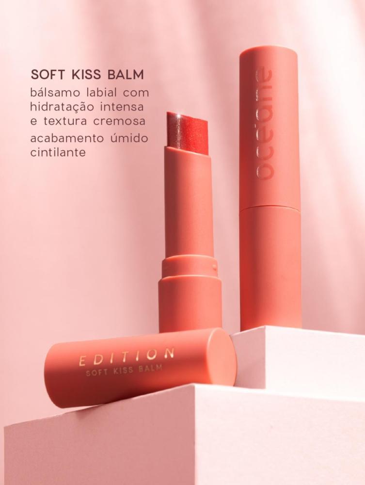 O Soft Kiss Balm hidrata e dá um lindo tom rosa coral cintilante aos lábios instantaneamente, combinando os efeitos da maquiagem e do skincare para criar um lindo efeito de lábios molhados